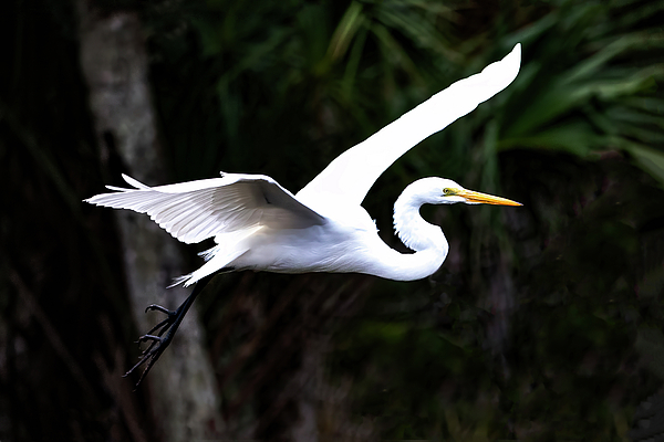 A graceful great egret with a long neck and sharp beak glides through the air, its wings elegantly outstretched. The dark forest background contrasts... more